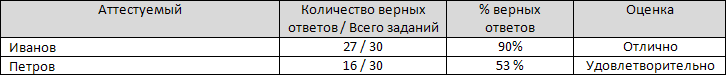 В результате прохождения теста аттестуемый получает оценку и информацию о проценте правильно выполненных заданий. Вся информация о прохождении всех тестов сохраняется в системе. Руководитель теста может просмотреть все ответы и допущенные ошибки, по любому аттестуемому.